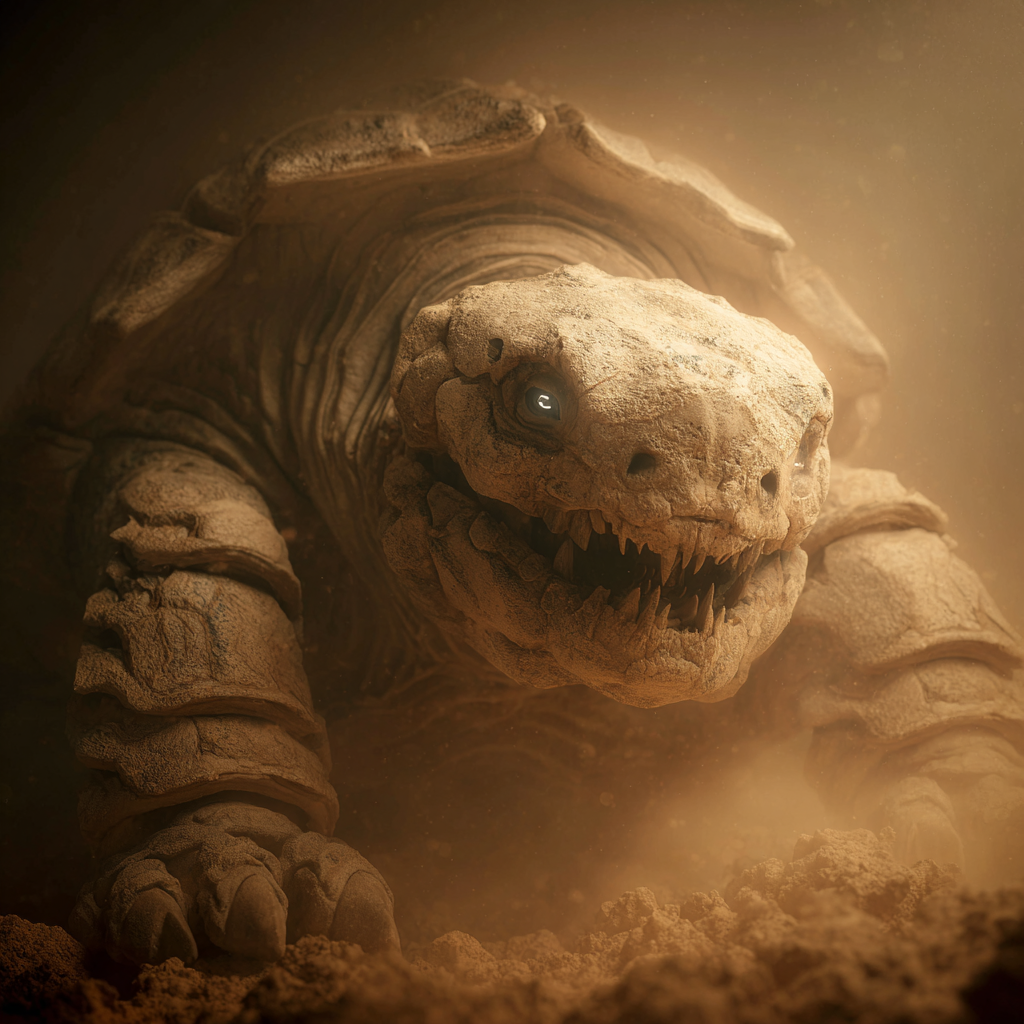 Jinkis are towering psionic constructs summoned by Worm Witches, shaped like giant turtles lumbering on powerful hind legs. Standing twice the height of a human, their shells crackle with Mirage energy, broad jaws set in a perpetual grimace, eyes glowing with the material that birthed them. These god-turtles draw from Japanese legends of divine guardians, twisted into Rakshasa weapons that anchor the frontline like unyielding walls.