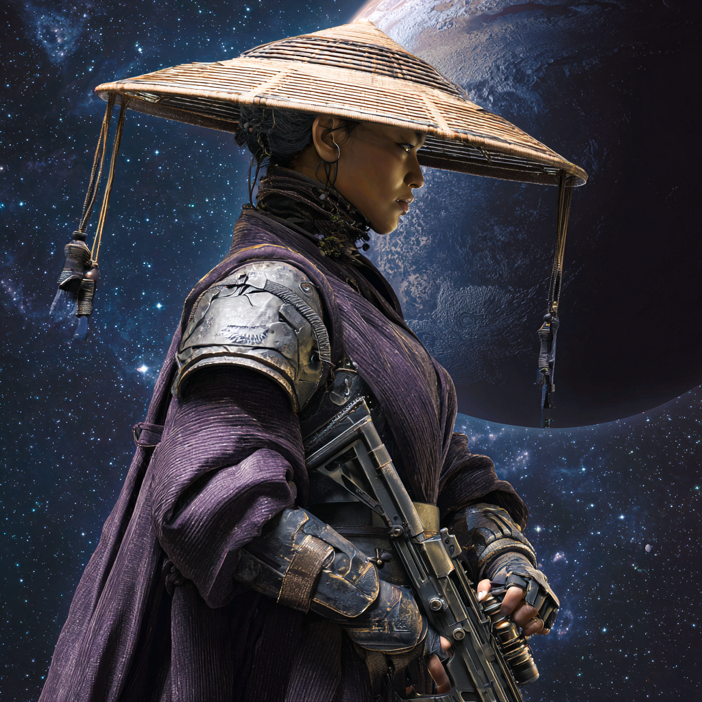 Each Padma Lancer wears a sugegasa woven from Devithar bamboo, harvested from the innermost planet’s nearside forests where the trees endure Proxima Centauri’s relentless stellar radiation. This bamboo possesses extraordinary properties—lightweight enough for marathon treks yet dense enough to deflect kinetic rounds and absorb energy weapon blasts. In close quarters, some Lancers unhook their hats and wield them as improvised shields, the wide brim catching blades and deflecting strikes. Veterans bear hats scarred from countless battles, each crack and scorch mark worn as a badge of survival.