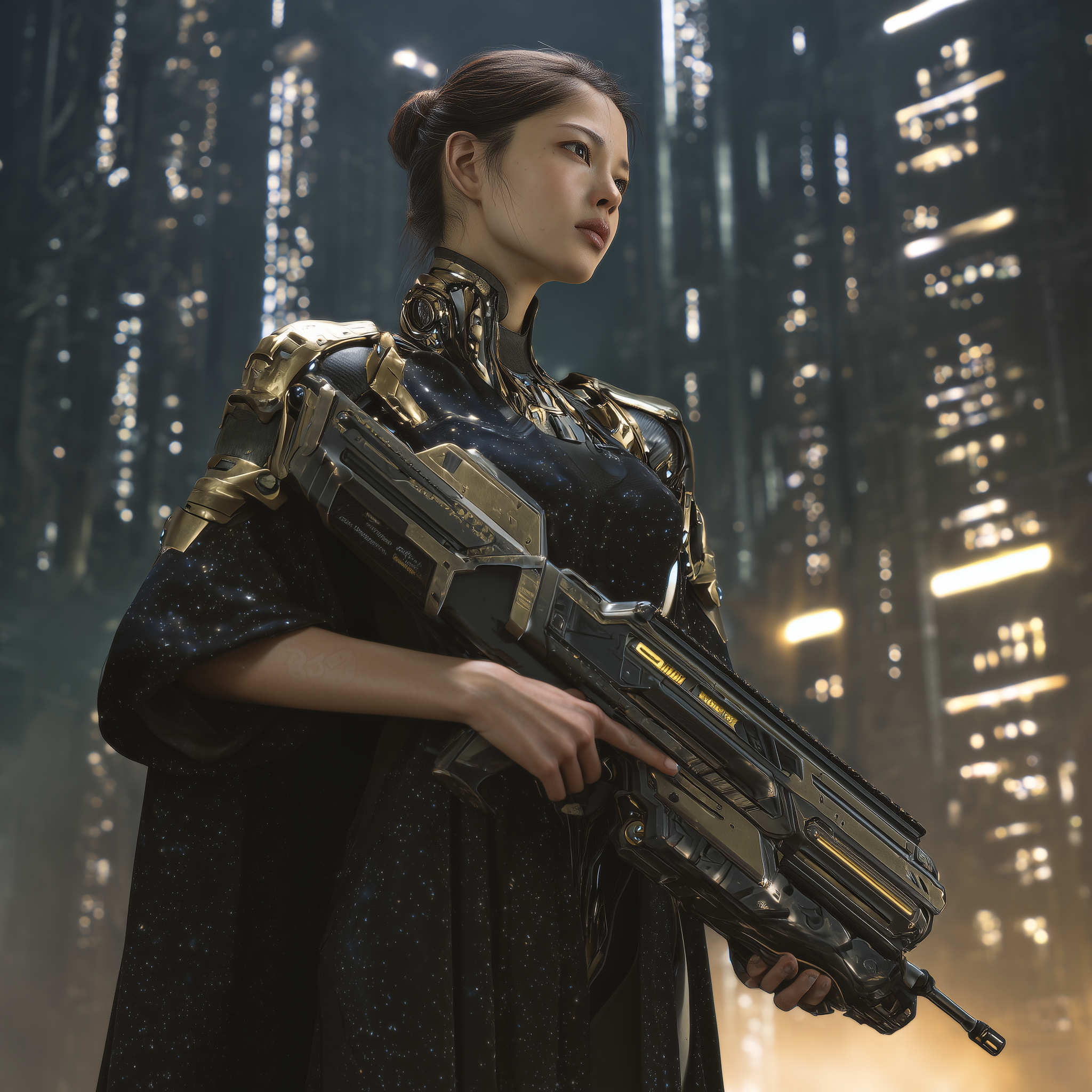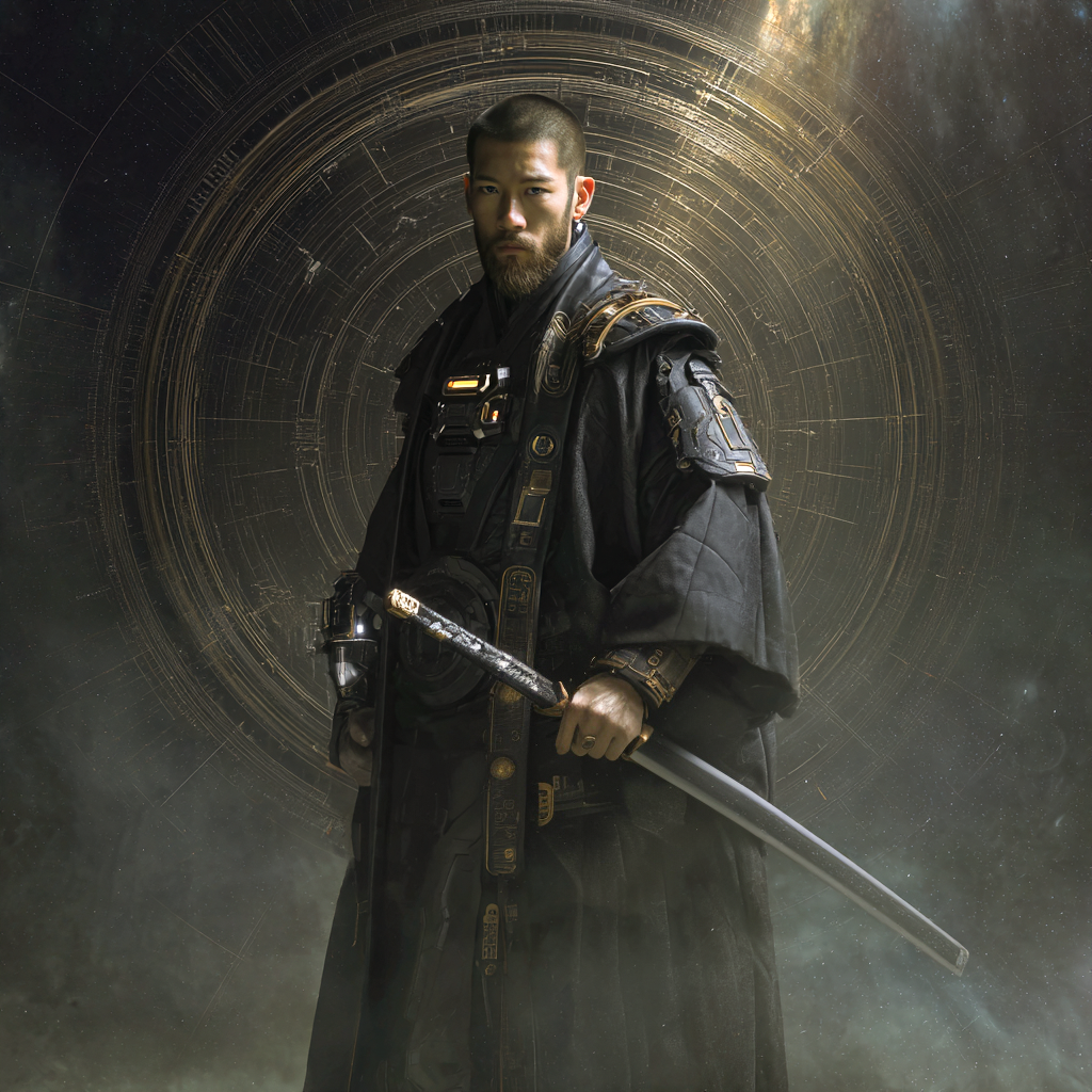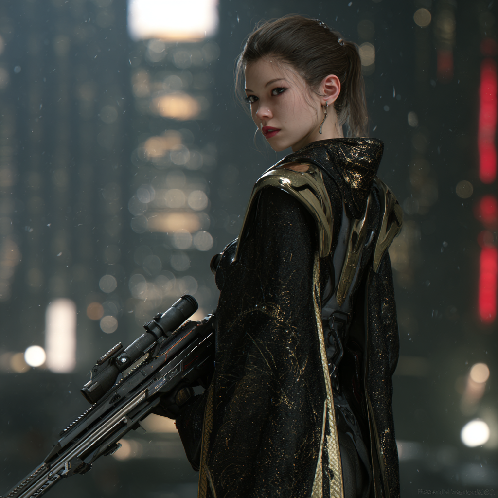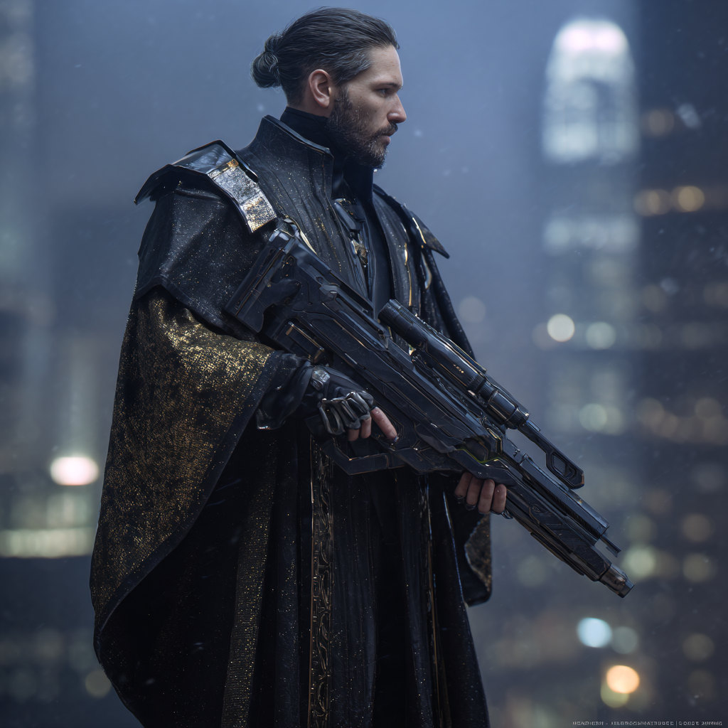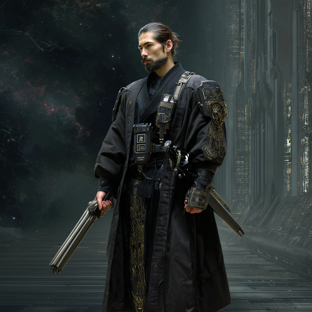 Their uniform consists of black fitted longcoats over tactical underlayers, with gold circuitry embroidery tracing traditional patterns along the sleeves and lapels. Standard equipment includes the Raiden shock katana, an electrified blade capable of non-lethal incapacitation or lethal force depending on power settings. The weapon serves both practical and symbolic purposes: visible authority without the aggressive posture of firearms, effective for close-quarters work in Xing Hong’s crowded streets and corridors.
