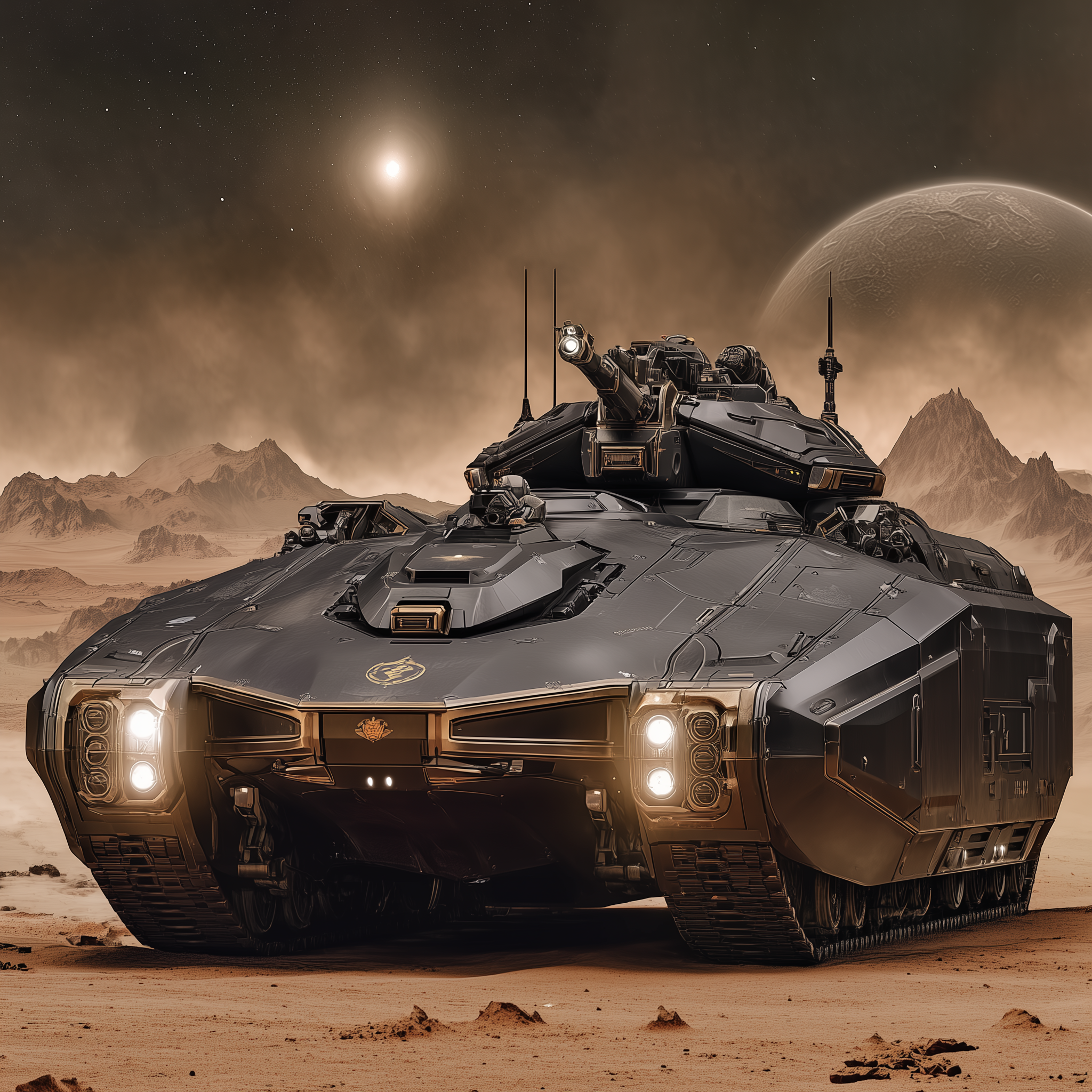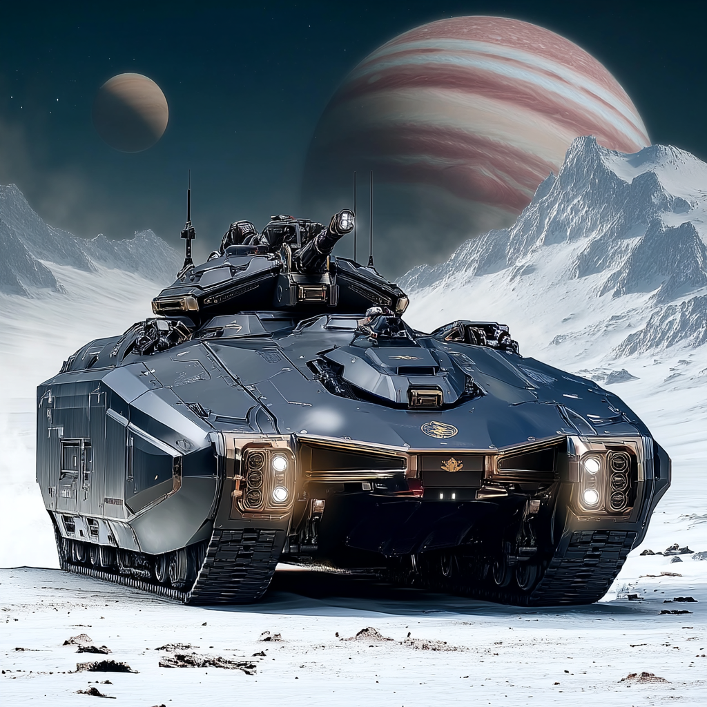 The design prioritizes protection over speed or elegance. Heavy black armor plating covers every surface, with gold trim tracing the edges in what engineers insist is “traditional aesthetic choice” rather than vanity. The interior accommodates a full Blackcoat squad plus additional personnel—up to nineteen people—with bench seating along both walls and weapon racks between them. A roof-mounted turret provides suppressive fire during hot extractions, while reinforced treads handle the Hellas Basin’s rocky terrain and Dragon District’s debris-choked streets with equal reliability.