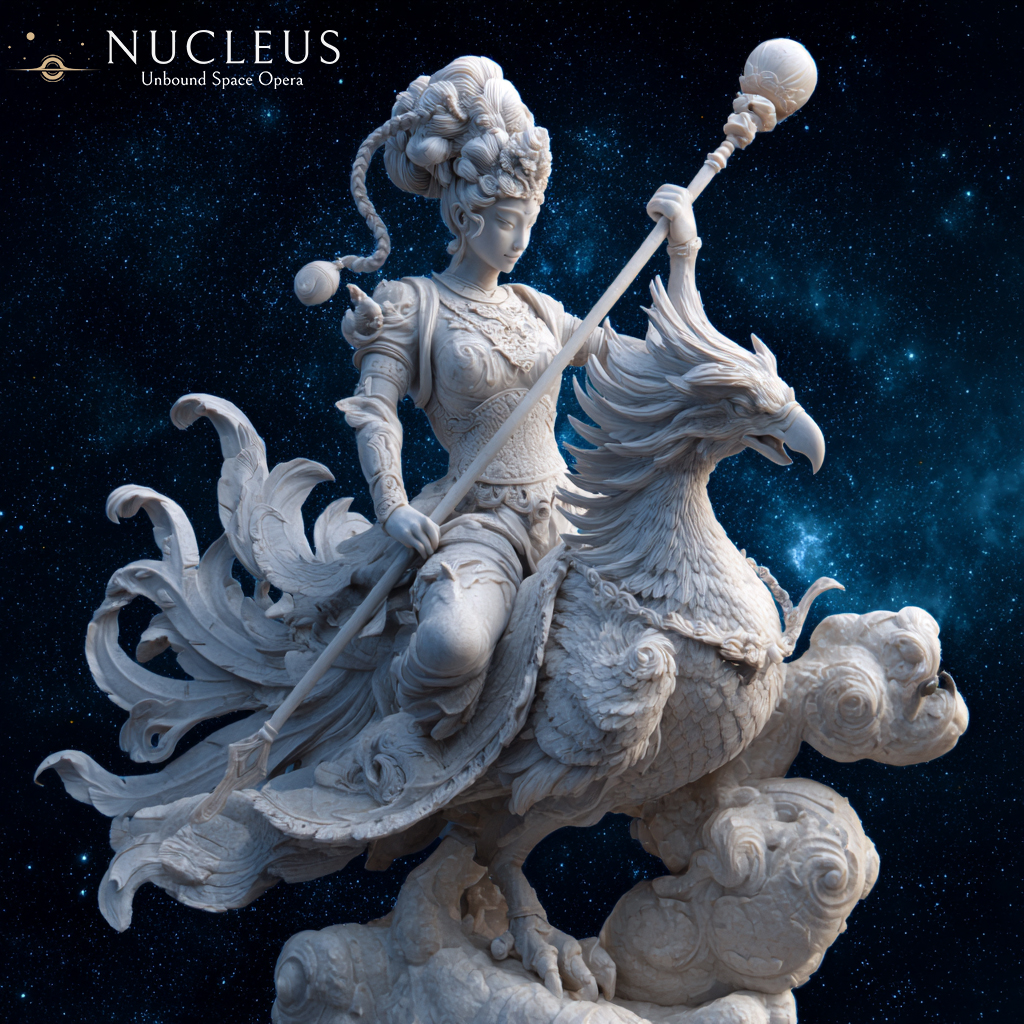 Depictions show a serene woman in elaborate armor riding a phoenix, carrying a staff topped with a luminous orb. Her expression remains calm regardless of context. War or lovemaking require the same centered focus. The phoenix mount connects her to Xing Hong’s civic identity; the city’s flag features a golden phoenix among Bauhinia blakeana blossoms, encircled by stars against a black field.